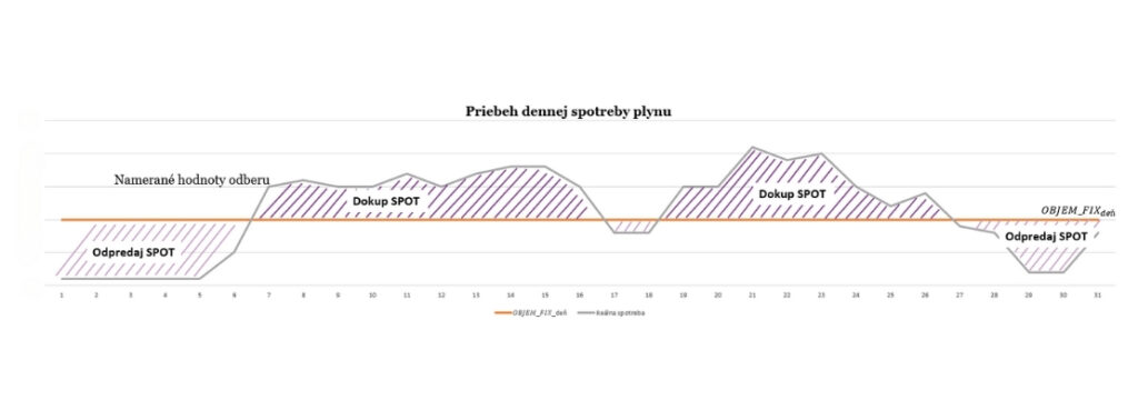 3. V prípade, že spotreba prekročí fixnú časť objemu, pripočíta sa dokupovanie chýbajúceho objemu plynu na spotovom trhu. Naopak, pri nedočerpaní predpokladaného fixného odberu v danom dni sa vypočíta výnos za odpredaj nespotrebovaného plynu na spotovom trhu.