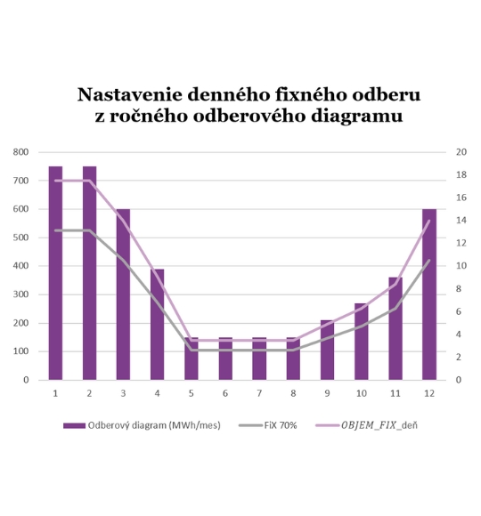 1. Zo zmluvného ročného objemu dodávky sa definuje percentuálny podiel fixnej časti a podľa dohodnutého odberového diagramu sa prepočíta na každý mesiac a následne aritmetickým priemerom na daný deň v mesiaci.